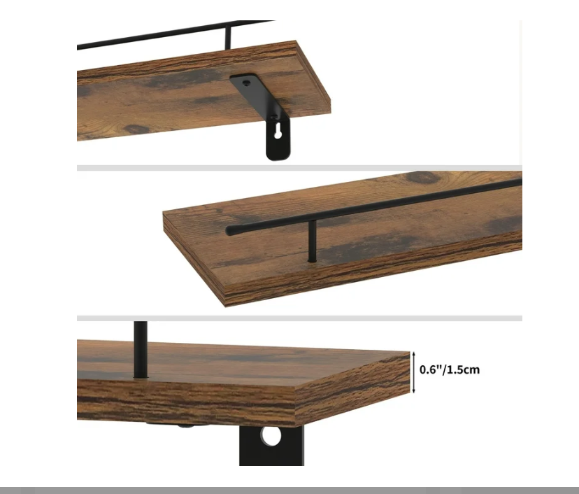• Durable Materials: Made of wood panels and black L-shaped matte baked black iron frame with metal guards on the front to prevent items from falling.