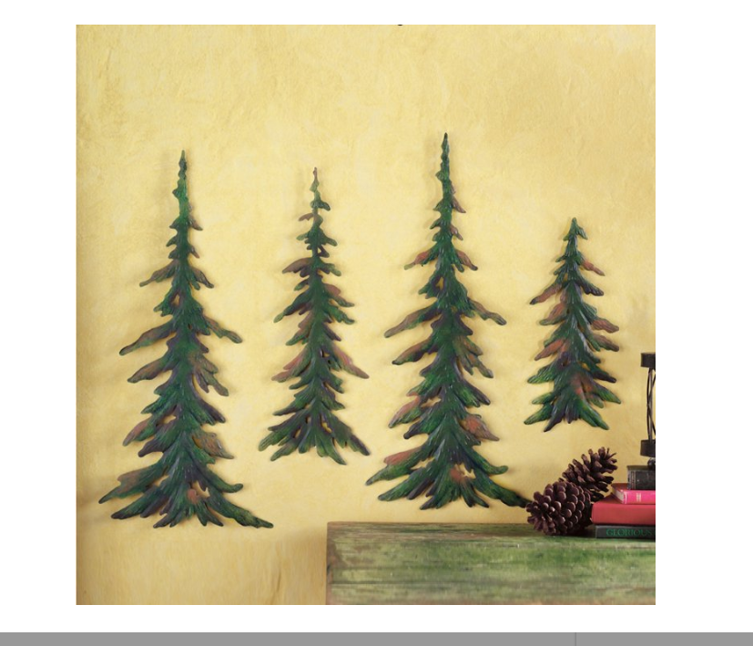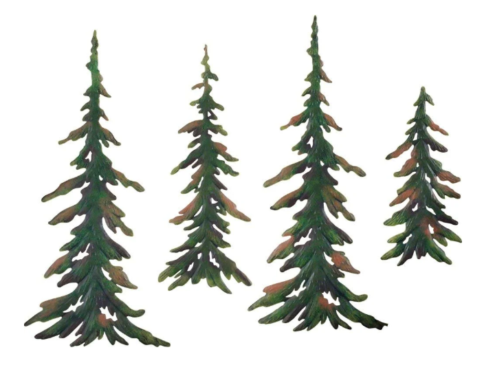 Evergreen Wall Decor: Transform any roomfrom the bath to the deninto a cozy, woodland getaway. An entire pine forest has been recreated in subtly dimensional metal and painted to give it a walk in the woods look you’ll enjoy all year round. Comes with a hook on the back for easy hanging. All four included. Iron. Two big trees: 11″W x 24 1/4″H; Smaller tree: 7″W x 19″H; Smallest tree: 5 1/2″W x 14″H.